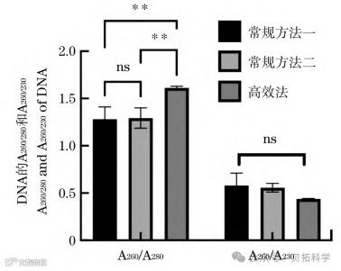 图1 三种提取方法A260/A280和A260/A230的显著分析(ns表示无明显差异,**表示P<0.01)