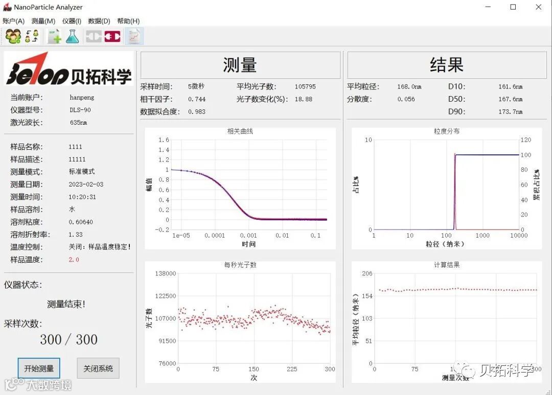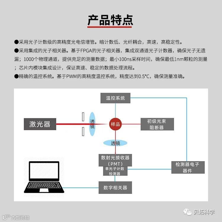 贝拓科学的纳米粒度仪通过动态光散射技术,对0.7nm-10um微粒的粒径及粒度分布进行表征。该仪器采用动态光90°散射,特定的光子相关器接收光信号,其准确性和重复性均小于2%。软件上,一个样品经过300次的测试,让数据更具有准确性和统计性,目前广受用户好评。