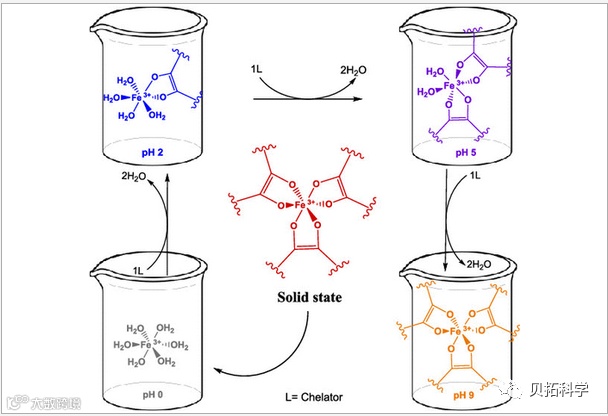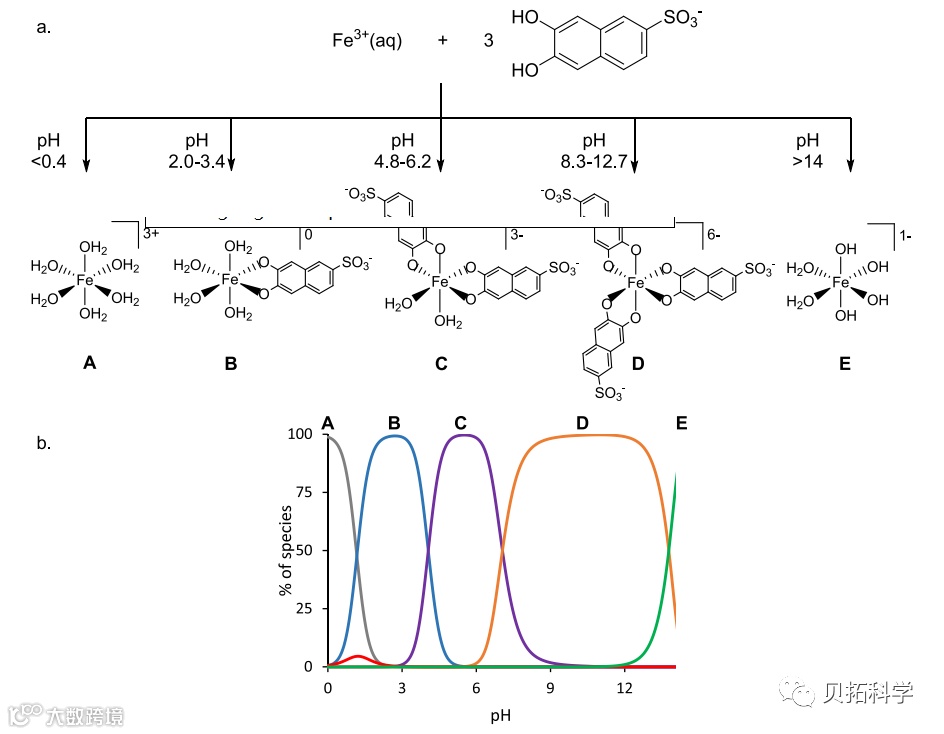 以铁(III)与2,3-二羟基萘-6-磺酸盐(DHNS)配体为例,通过其相互作用在pH为 0 ~ 13范围内形成的不同的配位结构,并可以很容易地通过它们的颜色来区别不同pH值的溶液。它们的可见电子吸收光谱可以用紫外-可见(UV - Vis)光谱仪收集和分析。