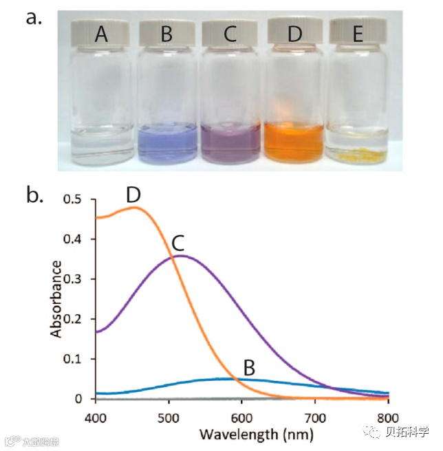 将金属和配体以相同的摩尔比1:3混合,将这些溶液的pH值(在搅拌的同时)分别调整为0 - 0.4(样品A), 2 - 3.4(样品B), 4.8 - 6.2(样品C)和8.3 - 12.7(样品D)。另一个样品将制备无配体Fe(III),调整到最高pH范围(样品E)。由于存在不同的Fe(III) DHNS种类,这些溶液中的每一种都具有不同的颜色:样品A是Fe(III) (aq)(无色);样品B为Fe(DHNS)(蓝色);样品C为Fe(DHNS)2 3−(紫色);样品D为Fe(DHNS)3 6−(橙色);样品E为水解铁(III)(橙色锈沉淀)(图2a)。由一个或多个基团制备的溶液A - E的可见光谱将使用UV - Vis光谱仪收集与分析。