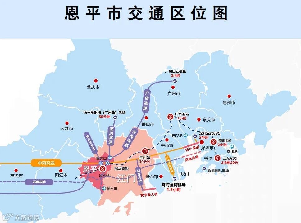 广东省恩平市地处粤港澳大湾区,区位交通便利。沈海高速、中阳高速贯通全境,深中通道与黄茅海大桥通车后,至深圳、珠海机场仅需90分钟,未来广州新机场建成后,通勤时间将进一步缩短至30分钟。