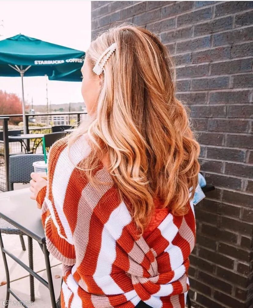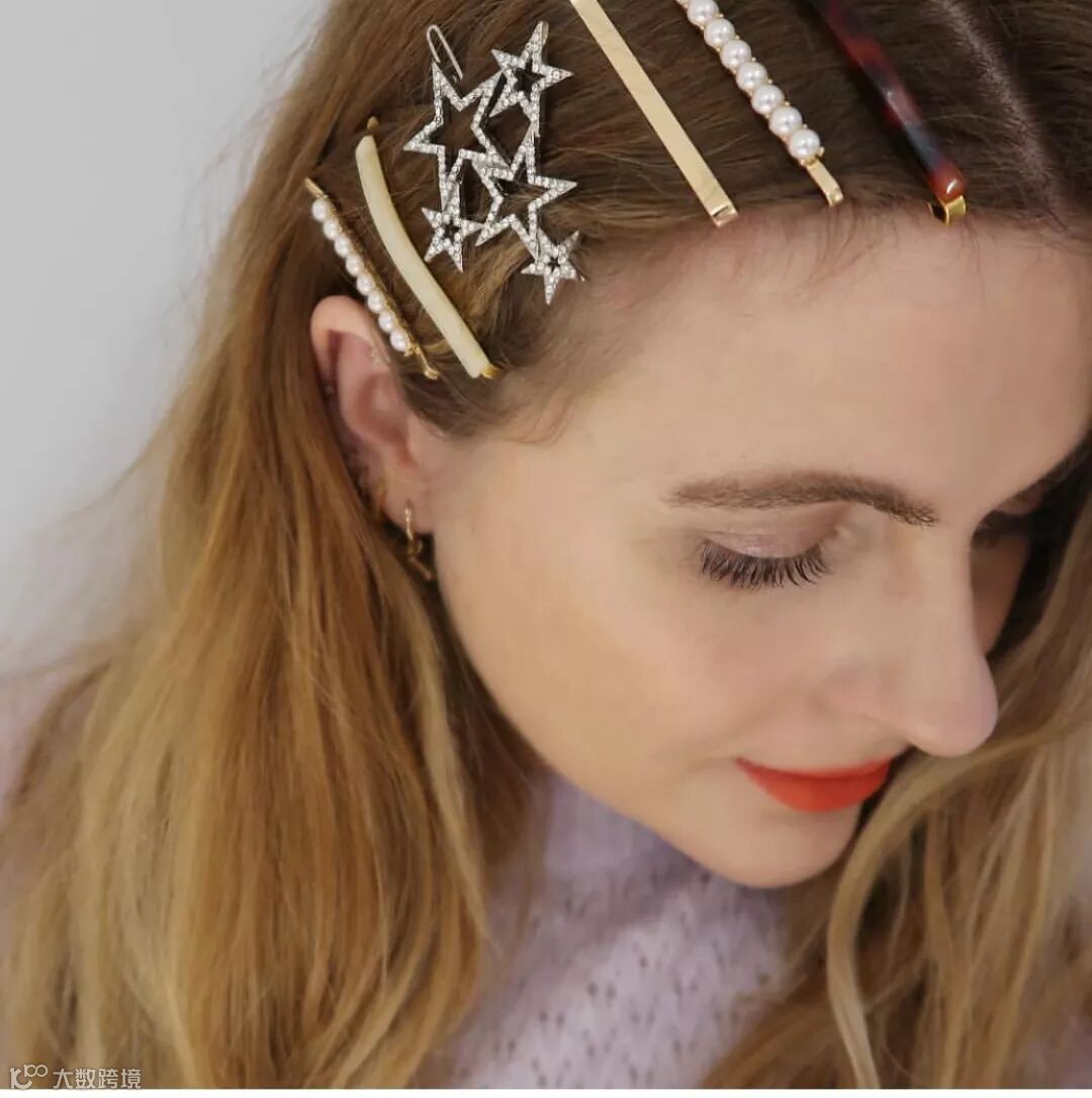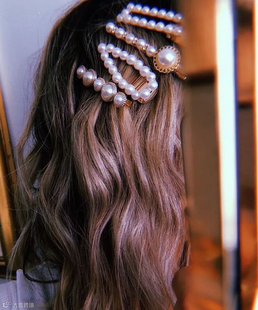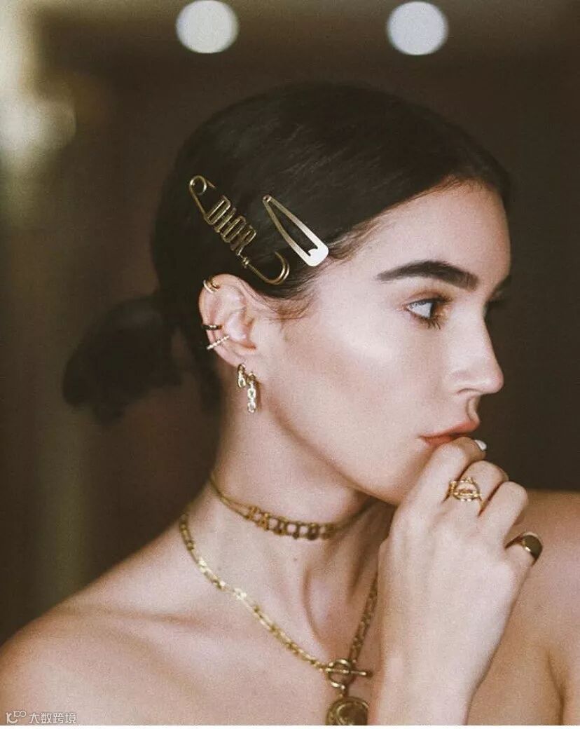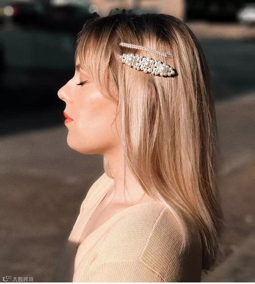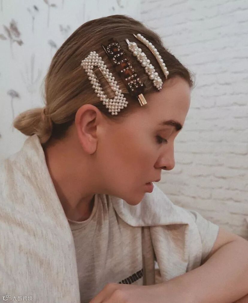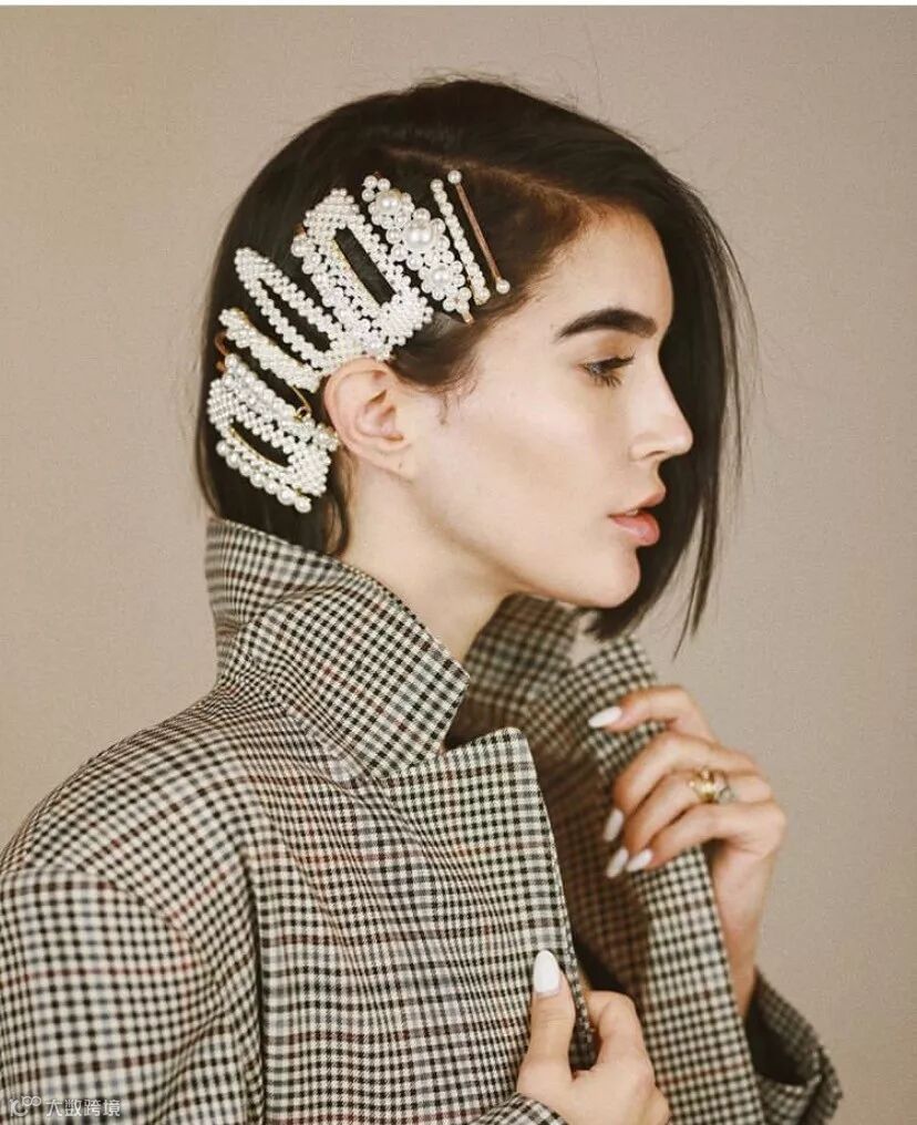如果你五官洋气气质出众,那么也可以像大多数ins博主一样,选用2-3种夸张的珍珠或水钻发卡并列使用。还想要更多?请凭自信力逐步增加。