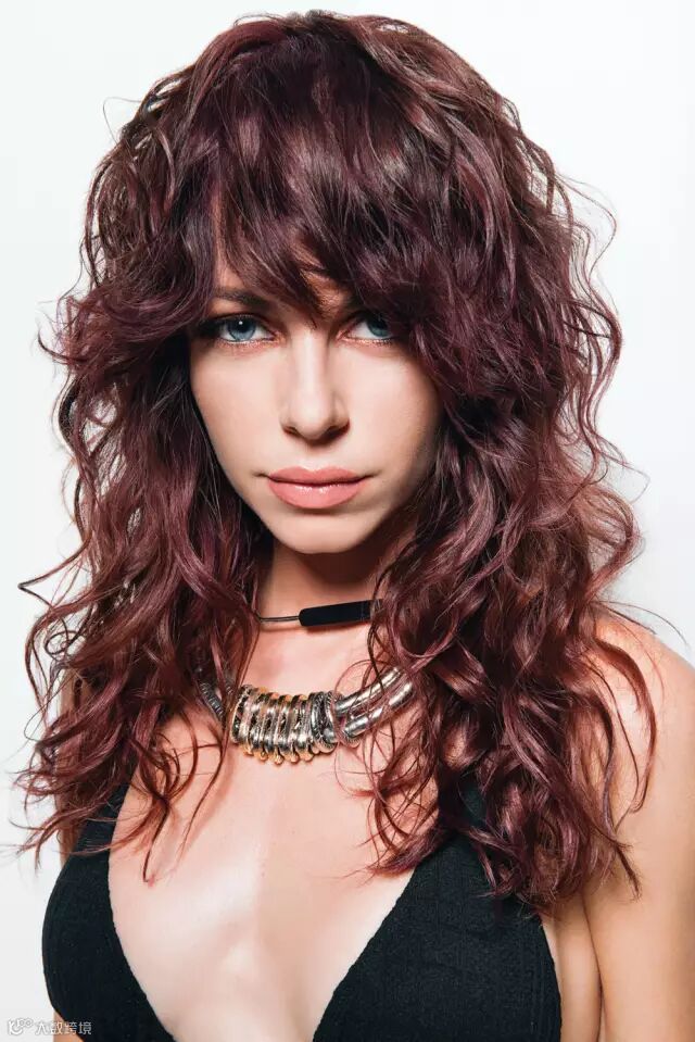 热辣的波浪卷丰盈蓬松,枣红色均匀覆盖
