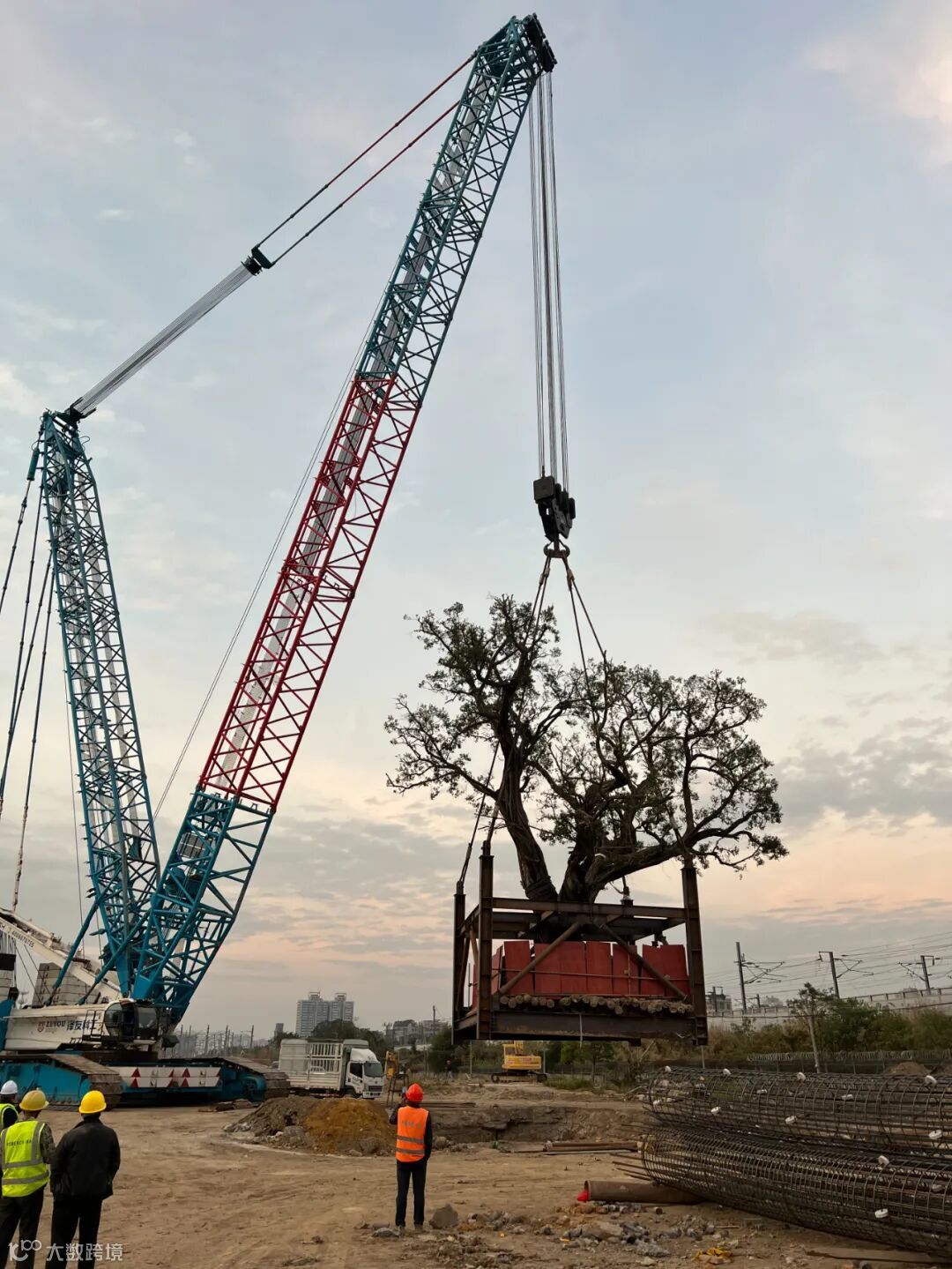 阶段二:实施土球挖掘与包裹、履带吊吊装运输、种植、树体支撑等;