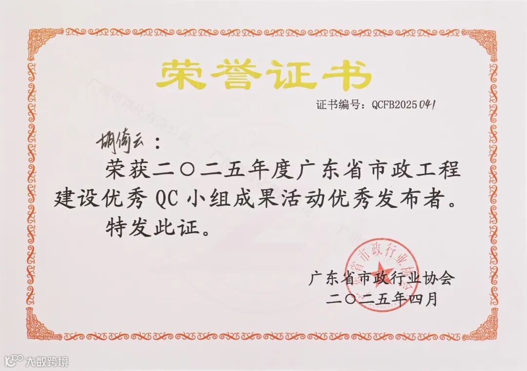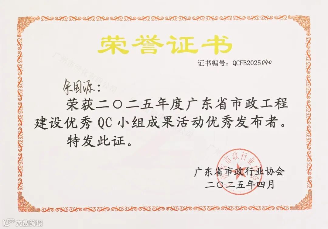 2025年4月23日至25日,2025年度广东省市政工程建设优秀QC小组活动成果暨质量信得过班组发布会于台山盛大举行。此次盛会汇聚了全省市政行业施工单位质量管理部门负责人、技术人员及质量管理小组成员等超1000人,共同探讨市政工程质量管理前沿技术与创新实践。