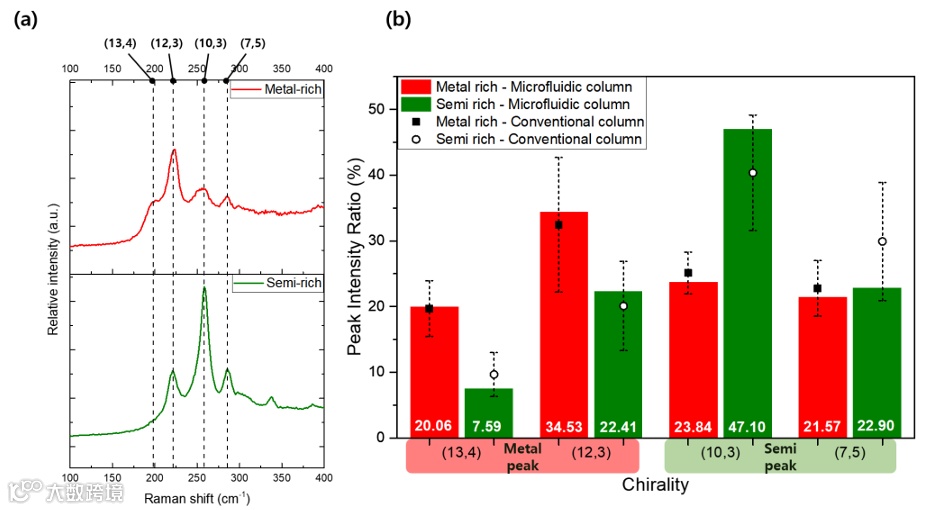 图2: (a) 富金属单壁碳纳米管样品(上)与富半导体样品(下)在径向呼吸模式(RBM)区域的拉曼光谱,突显出四个特征手性峰:(13,4)、(12,3)、(10,3)和(7,5)。垂直虚线标示对应各手性峰的拉曼位移。(b) 金属富集与半导体富集组分中四种手性峰的相对强度比(%),对比常规色谱柱与微流控色谱柱结果。强度比差异证明基于电子类型的分离工艺能有效富集单壁碳纳米管。