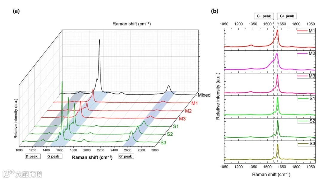 图3:(a)拉曼光谱对比显示金属含量丰富(M1-M3)与半导体含量丰富(S1-S3)的SWNT组分在广泛光谱范围内的差异,包括D、G和G'峰。堆叠图突显了对应于每个分离组分的不同光谱特征。(b)对G峰的放大视图,着重展示了各样品中的G和G+成分。金属含量丰富与半导体含量丰富组分之间峰位和形状的差异,表明了分离效果以及萃取过程中电子类型特异性相互作用的存在。