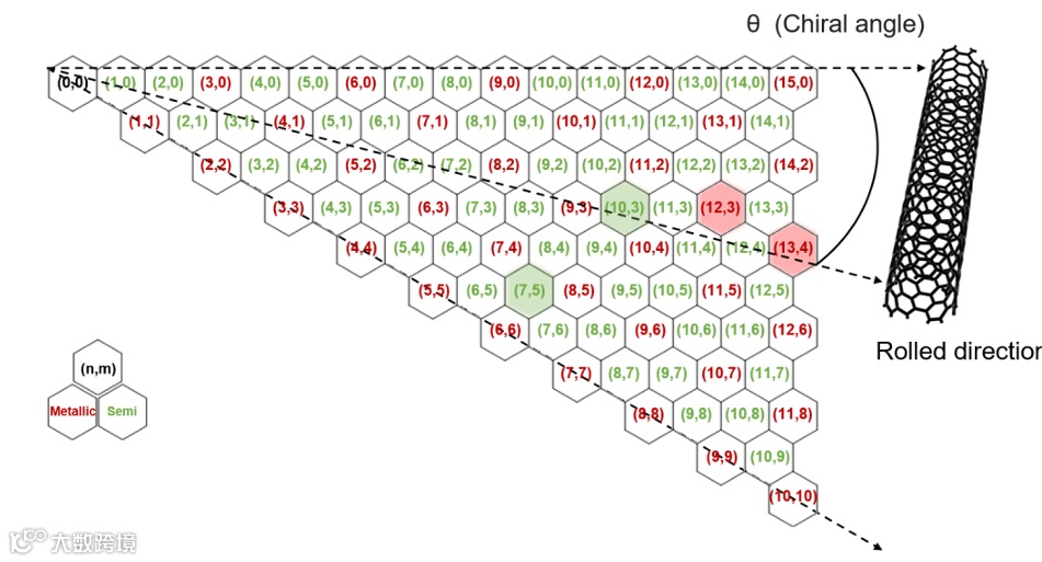 图1:SWNTs的手性结构的电子特性:六角晶格定义了手性指数(n,m)、手性角(θ)与卷曲方向之间的关系,这些参数共同决定了特定SWNT是金属性的(红色)还是半导体性的(绿色)。图中着重标出了四种具体的手性状态一一(13,4)、(12,3)、(10,3)和(7,5)。