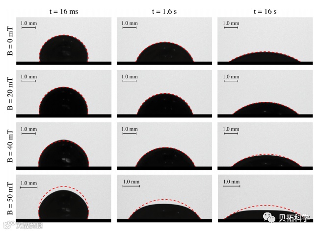 在图2中,我们展示了在亲水基质上润湿动力学过程中铁磁流体滴的图像。我们通过改变磁体和基底之间的距离Z来考虑不同的磁通密度B值。更具体地说,B表示磁通密度轴向分量在r = 0时的幅值,对应于钕圆盘磁体的中心位置。