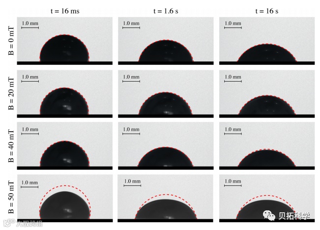 考虑不同的磁感应强度B值时,在疏水基材上磁滴的润湿动力学图像如图3所示。当B<µ0Ms时,可以注意到磁滴在润湿动力学过程中呈现球形帽状。当磁通密度高于饱和磁化强度(B = 40 mT)时,铁磁流体液滴在疏水玻璃载玻片(t = 16 ms)上释放几毫秒后,呈现出明显的球形帽形曲率。