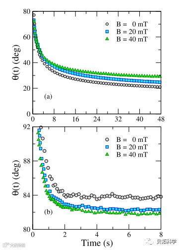 图4. (a)亲水性基底和(b)疏水性基底上铁磁流体滴接触角在不同磁通密度下的时间演化:B = 0 mT(灰色圆圈),B = 20 mT(蓝色正方形),B = 40 mT(绿色三角形)。