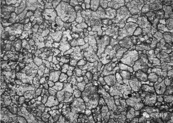 浸蚀处理后的检测样品,可以利用金相显微镜观察到钢材的亚显微组织情况。大部分情况下,晶界处被漫反射所以不能进入物镜,所以晶界大多数呈现黑色。被晶界分割的即为钢材的组织结构,可以依靠检测结果对钢材进行定性分析,比如:材料的组织形貌,晶粒大小、非金属杂质等在组织中的含量和分布情况;材料组织结构与其化学成分之间的关系;确定各材料在不同加工工艺后的显微组织;判别材料质量的优劣等。例如:利用金相显微镜技术对奥氏体晶粒进行观察,可以把光线经由奥氏体内部晶界部分漫反射但也无法进入物镜,进而显示出一条条暗色的晶粒边缘。在钢铁上不同颗粒的化学成分虽然相同,但由于其原子排列位向不同,也能造成磨表面上各粒径的侵蚀深浅不同,这样在垂直灯光照射下,不同颗粒之间就产生了明暗不同的颜色,如下图所示。