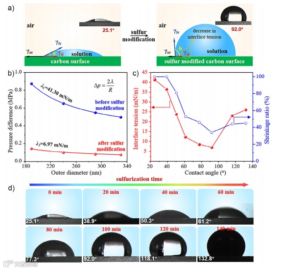 为解决坍塌问题,研究者提出了创新的“硫改性”策略,并通过接触角和界面张力测试精确验证了其效果与机制: