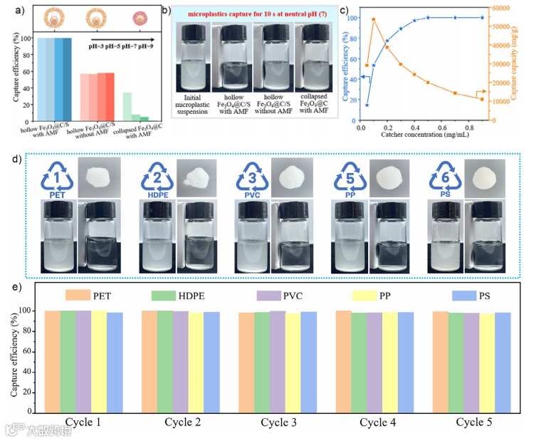 a) 10 mg mL−1 HDPE微塑料与0.5 mg mL−1磁性纳米颗粒在不同pH值(3、5、7和9)下的捕获性能。b) HDPE微塑料初始悬浮液及在不同样品(施加/不施加交变磁场)作用后的捕获效果照片。c) 中空Fe3O4@C/S纳米捕获剂在不同浓度下对HDPE微塑料的捕获效率与容量。d) 多种微塑料(PET、HDPE、PVC、PP及PS)的捕获测试。e) 不同微塑料的循环捕获效率。捕获条件:微塑料浓度10 mg mL−1,磁性纳米颗粒浓度0.5 mg mL−1,悬浮液体积5 mL,温度25°C,交变磁场强度60 mT(固定频率100 kHz),中性pH环境。