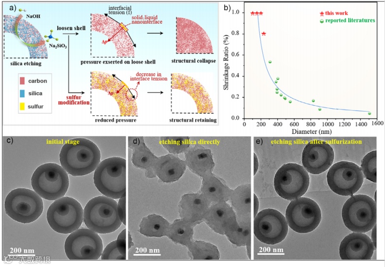 a) 中空纳米结构稳定性分析示意图。b) 本研究与文献报道(表S1)的收缩或共分析。透射电镜图像显示:c) 初始阶段(Fe3O4@C/SiO2)、d) 坍塌结构(Fe3O4@C)以及e) 经硫修饰及二氧化硅蚀刻后的中空结构(Fe3O4@C/S)。