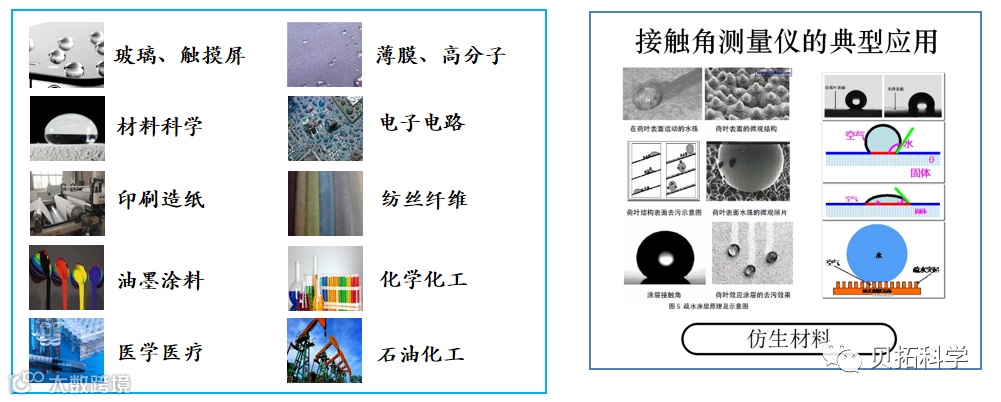 了解仪器原理后,我们需要知道接触角测量仪能不能满足在我们行业的测量,接触角仪的应用极为广泛,在很多行业都可以应用。