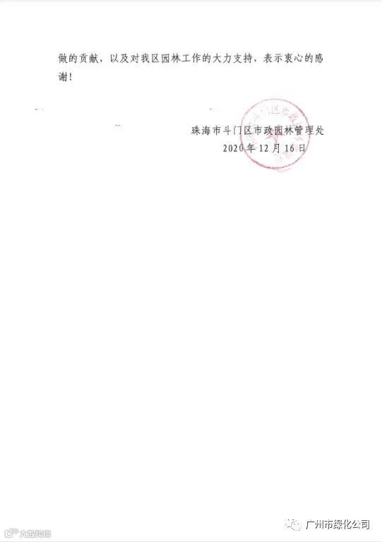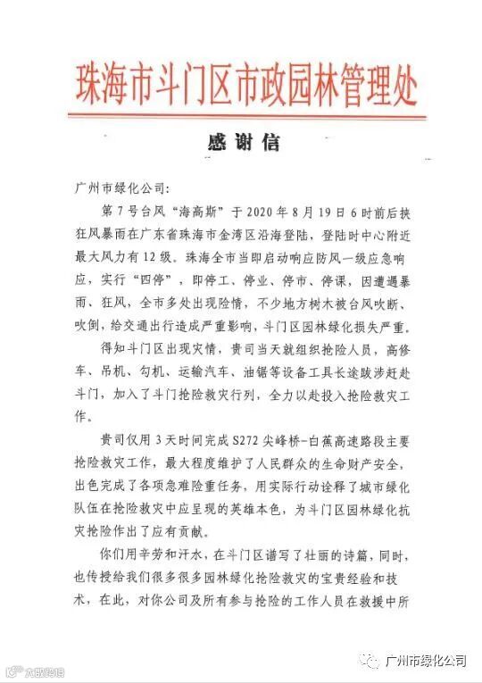 珠海市斗门区市政园林管理处充分肯定了我公司抢险救灾人员敢于担当、奋力苦战的工作精神和不畏艰难、奋勇直前的坚定决心;高度赞扬了我们在本次抢险救灾中的高效执行力和精良业务能力;诚挚感谢了我公司对珠海市斗门区园林绿化建设做出的贡献。