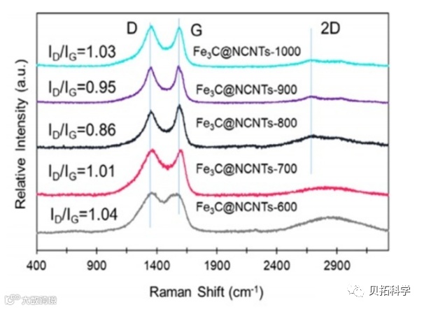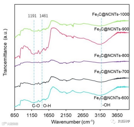 通过对样品的检测,学者[1]得到拉曼光谱图和红外光谱图分别对包裹Fe3C纳米粒子的氮掺杂碳纳米管(Fe3C@NCNTs)的表征。通过图像可以看出拉曼光谱更清晰,重叠带很少见到,谱图解析会更方便,反映出了合成材料的结构特征及石墨化程度。红外光谱检测到了含氧官能团,随温度的升高,石墨烯结构的进行演变,不稳定的O和N发生了分解。