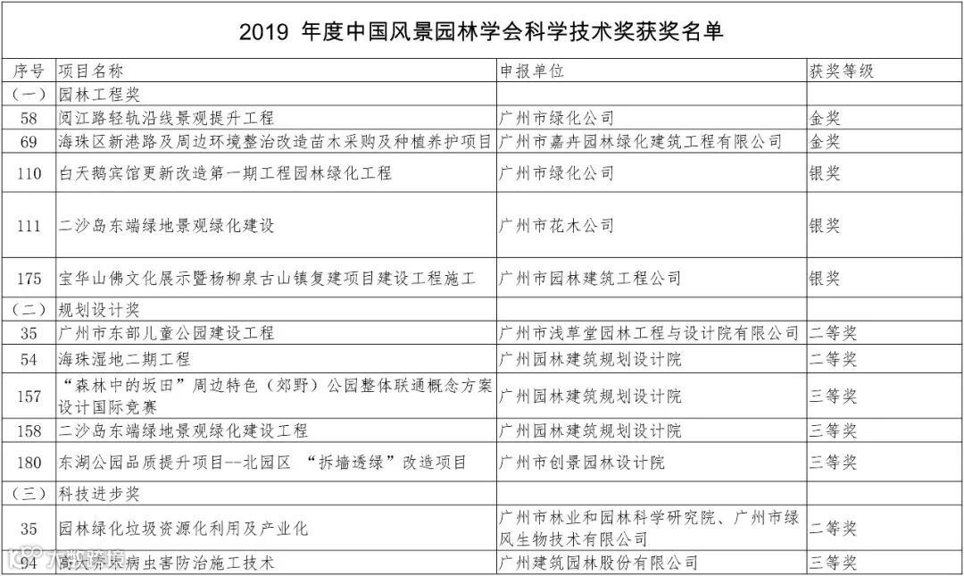 其中,由广州市绿化公司实施的阅江路轻轨沿线景观提升工程、广州市嘉卉园林绿化建筑工程有限公司实施的海珠区新港路及周边环境整治改造苗木采购及种植养护项目荣获“园林工程奖”金奖,由广州市绿化公司实施的白天鹅宾馆更新改造第一期工程园林绿化工程、广州市花木公司实施的二沙岛东端绿地景观绿化建设工程、广州市园林建筑工程公司实施的宝华山佛文化展示暨杨柳泉古山镇复建项目建设工程荣获“园林工程奖”银奖;由广州园林建筑规划设计院设计的海珠湿地二期工程、广州市浅草堂园林工程与设计院有限公司设计的广州市东部儿童公园建设工程荣获“规划设计奖”二等奖;广州市林业和园林科学研究院联合广州市绿风生物技术有限公司申报的园林绿化垃圾资源化利用及产业化荣获“科技进步奖”二等奖(其他获奖名单详见附表)。