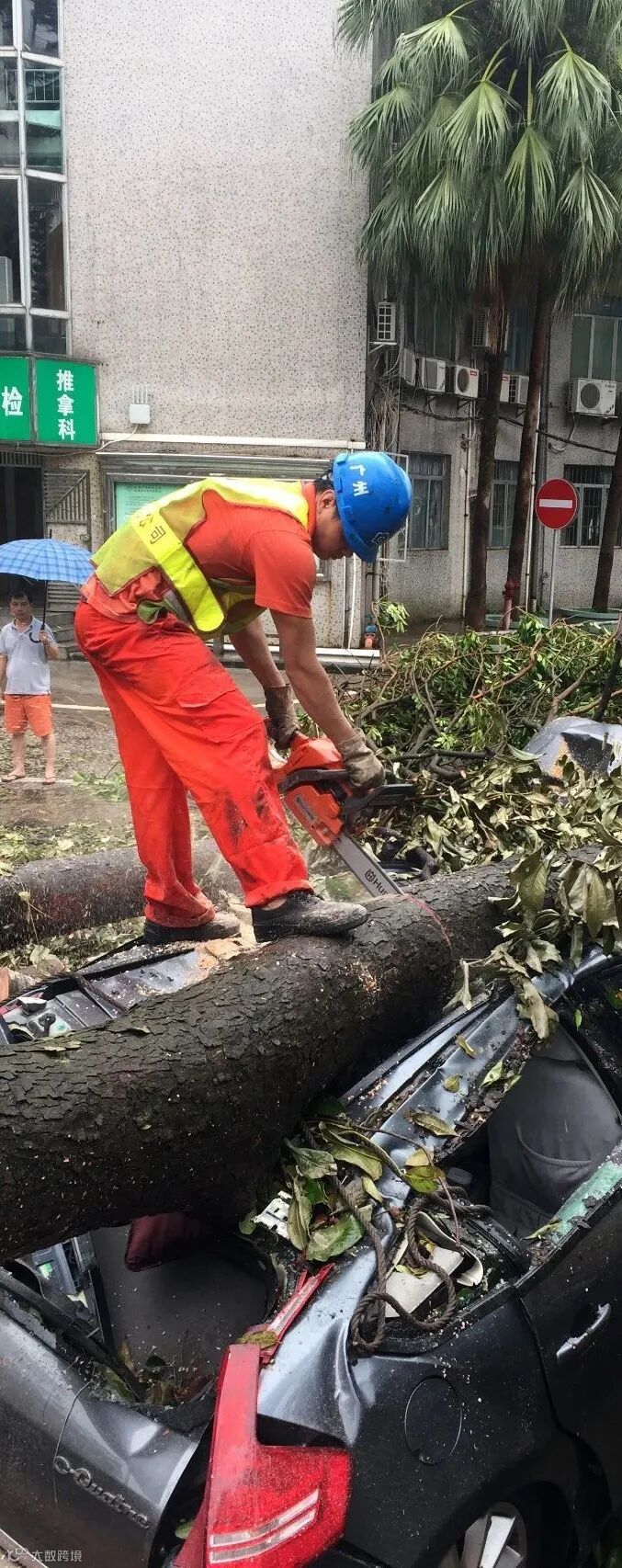 直到第一次参加台风应急抢险救援,陈承宇看着眼前倒伏的大树和枝干,身上的橙色队服湿透风干又再次被断续的雨水和汗水混合着浸湿,脚上的雨靴里也灌满了泥沙和积水,湿润的风吹起一身鸡皮疙瘩,先前的一腔热血似乎也快被阴绵的雨水浇灭。“大家再坚持一下,清理完这个片区我们再休息!”带队抢险的潘款星看出了队员们的疲惫,为大家加油鼓气,“我们多坚持一小时,道路秩序就早一小时恢复,市民的正常生活也少受一小时影响!”说罢,潘款星便举起工具继续清理杂乱的树干。