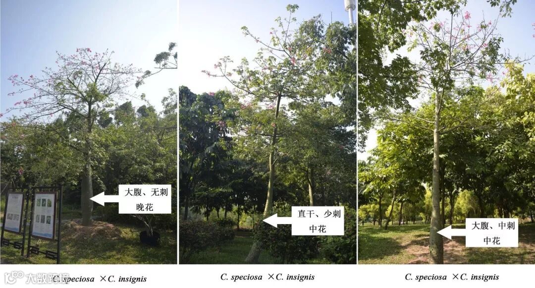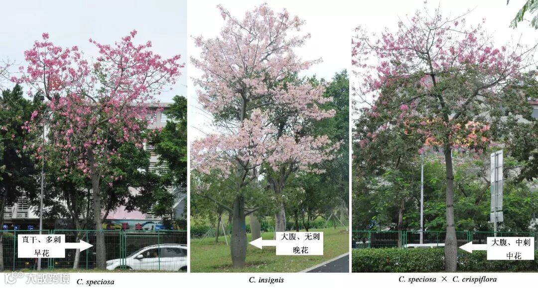 简而言之,即:美丽异木棉(C. speciosa)常表现为开花早(7~9月),树干直且带刺,花瓣条纹多,雄蕊附属物为红色;另一个物种C. insignis则表现为开花晚(10~12月),树干大腹无刺,花瓣条纹少,雄蕊附属物为白色;而物种C. crispiflora在该研究中没有纯种个体存在;杂种的性状则表现不一。
