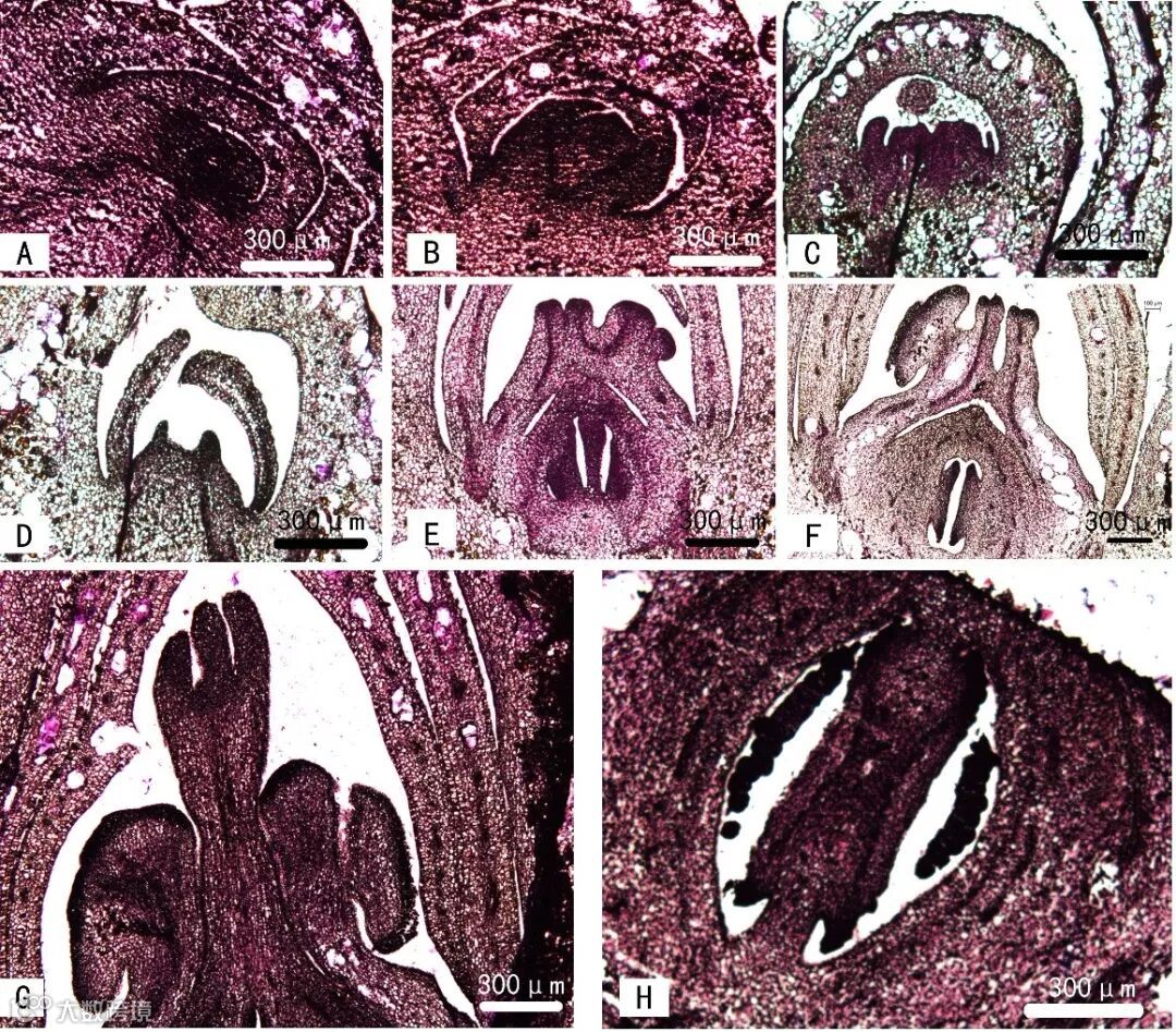 注 A:生长点前分化期;B:萼片分化期;C、D:花瓣原基分化期、成熟期;E、F:雄蕊附属物原基形成期;G:雌雄蕊原基形成期;H:胚珠形成期。