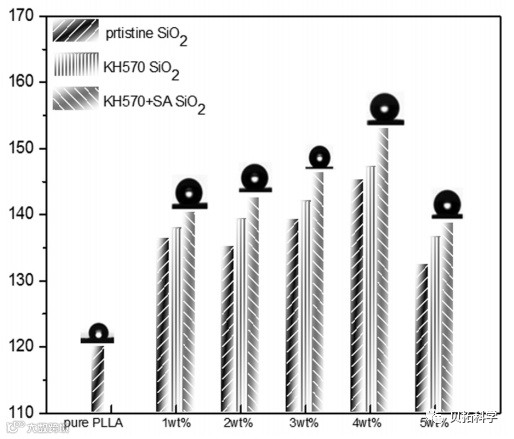 另外,陈涛[1]等人通过溶剂诱导相分离法,制备了超疏水PLLA/SiO2复合膜,用接触角仪测量其表观接触角达153°。