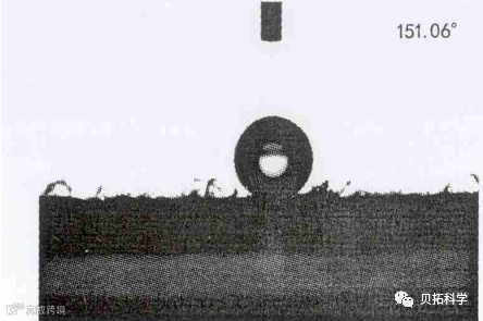 杨艳丽[2] 等人采用相分离法,以聚丙烯为原料,通过聚合物/(溶剂-非溶剂) 的相分离方法制备了超疏水聚丙烯微孔膜。通过接触角仪的测量超疏水表面接触角均达到151.06°,该表面制备具有超疏水效果。