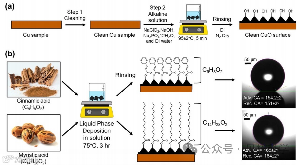 图1. (a)铜基纳米结构的制造步骤和(b)在(a)表面上天然疏水化学物质的应用方法,以及相应的推进接触角图像。