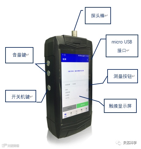 如上图,PTRam785手持式拉曼光谱仪为一体机,机身可见音量按钮、开关机按钮、探头棒、USB接口、测量按钮,触摸显示屏,后置摄像头等七大部分,另外配有固体和液体测试的专用配件,以便设备更好地收集拉曼信号。