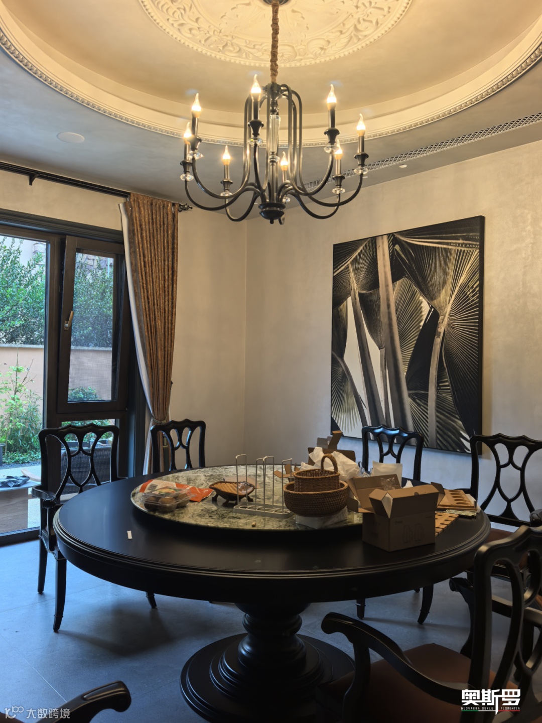 移步餐厅,圆形的黑色实木餐桌上方,复古的铁艺吊灯垂落暖光,墙面依旧是威尼斯经典・绒面的温柔包裹。这里的低饱和米色绒面带着浅淡的肌理起伏,没有明显的色彩深浅变化,却在光线映衬下更显醇厚,如同宜昌老巷里的时光沉淀。灯光下,绒面的光泽柔和地铺洒在餐桌之上,与桌上的茶盏、果盘相映,让围坐用餐的时刻多了一份温馨与雅致。墙面那幅黑白棕榈叶装饰画,与绒面的温润质感形成碰撞,冷硬的线条与柔软的肌理交融,让餐厅既保留了用餐的烟火气,又不失艺术格调。奥斯罗 OULXU( 贵族系列)的威尼斯经典・绒面,以其适配多元风格的特质,让餐厅在新中式的框架里,融入了意式的松弛感,每一次举杯落筷,都仿佛与时光温柔相拥。