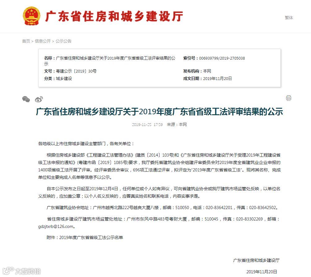 12月4日,广东省住房和城乡建设厅关于2019年度广东省省级工法评审结果通过公示期,广州市建筑集团属下广州市园林生态集团再创佳绩,荣获2019年广东省省级工法3项。