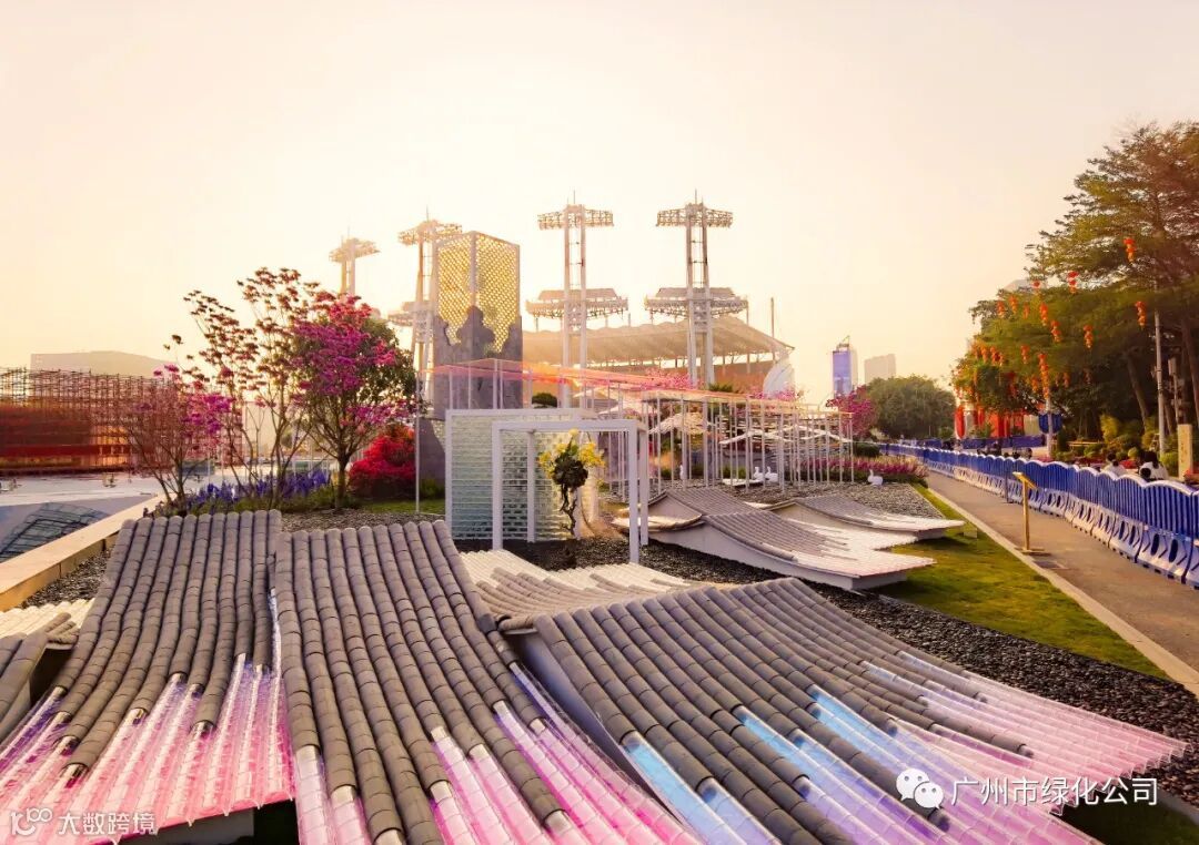 以四组剧幕式的造型构筑出一个步步有景观、处处有故事的时间廊,穿越其间,你能理解广州人为什么爱花恋花,那是大自然对广州城的馈赠,也是广州人对美好生活的寄托与向往。代表广州这座两千城未易城址的天选之城,在岁月长河里,留下的种种传奇:以镇海楼、龙船代表广州的山水格局,以陈家祠和趟栊门,代表广州人的安居乐业;近年引进的花植与新地址一起,体现新广州人具备更开阔的国际视野,为广州带来了更多层次的肌理,自此,花城,无时无处,不飞花。