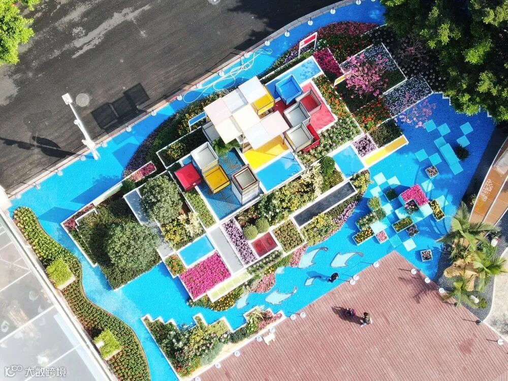 作品的基本构图提取了魔方的方格子,构图核心为由中心向四周放射性裂变的的魔方,魔方中央桥接着一颗晶莹剔透的魔方核心水晶锥,象征着大湾区城市群的诞生;水晶中央嵌有绿化公司 logo,寓意绿化公司建设美丽湾区的决心。魔方下是一组由荷兰艺术家蒙德里安波普作画推演而来的台地式花镜,画中的红、黄、蓝及黑色则采用不同半色透明 PVC 板替代,以呼应岭南套色玻璃的造园手法。最底部为像素化的蓝海绿洲图像,分别由白色砾石、蓝色砾石和“绿洲”组成,以及前方由灰色砾石铺成的鲸鱼群,呈现海湾这一地理特质。