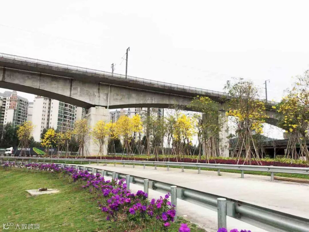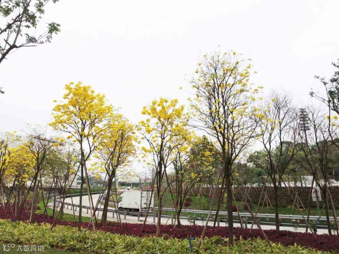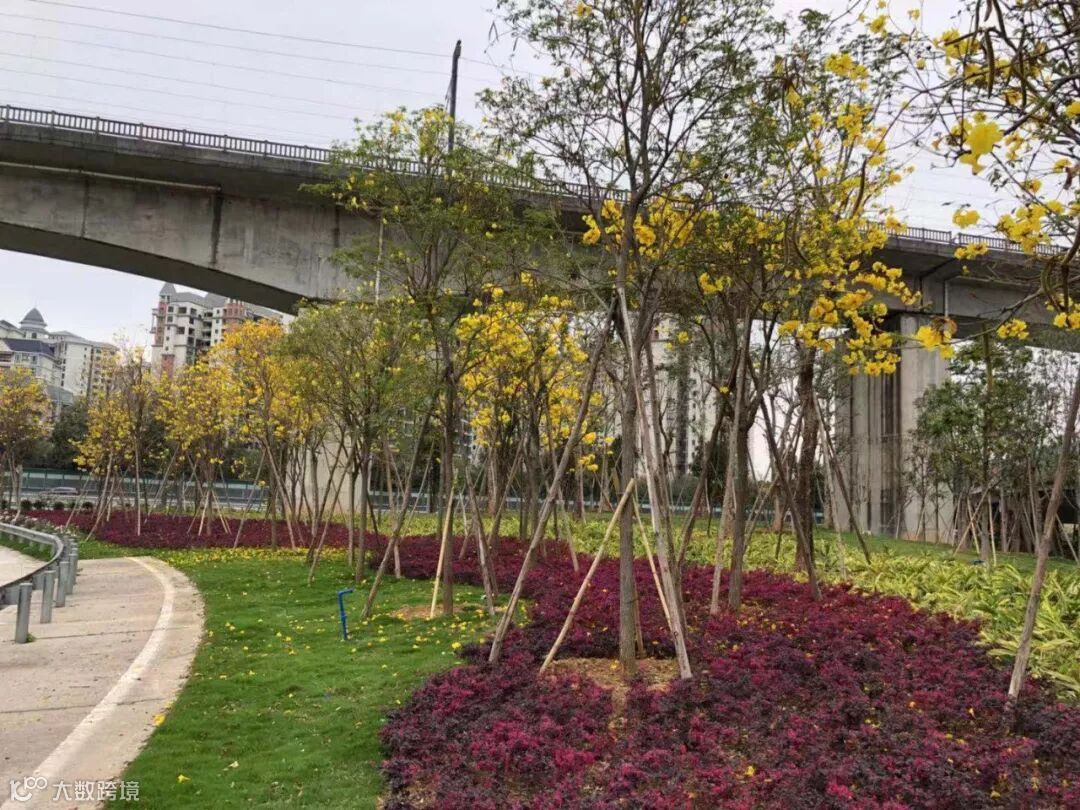 以色带结合开花乔木方式打造清爽景观,以宫粉紫荆、美丽异木棉为骨干树种,黄花风铃木点缀,营造花色组团景观。