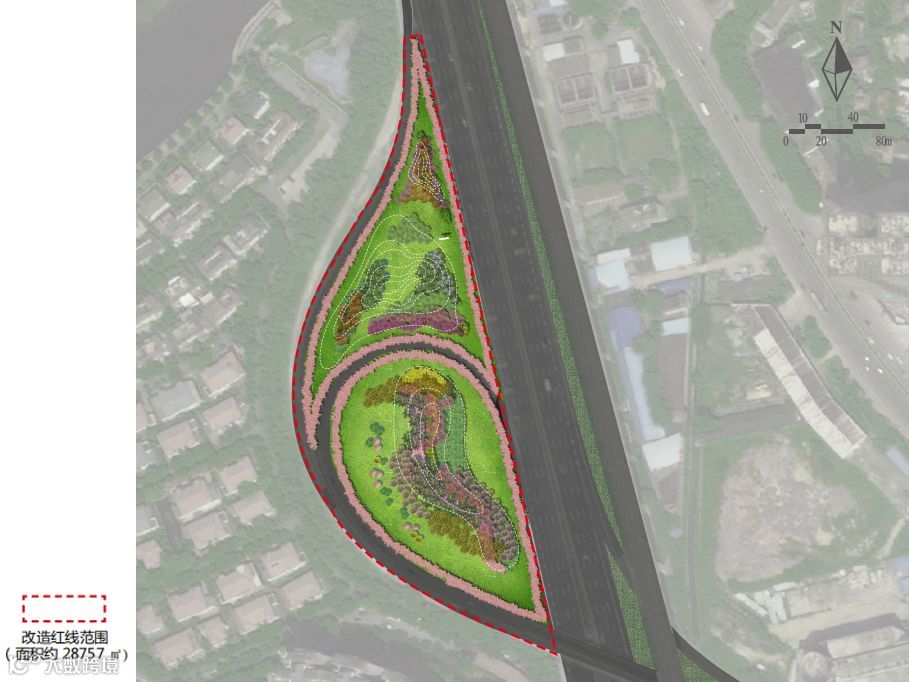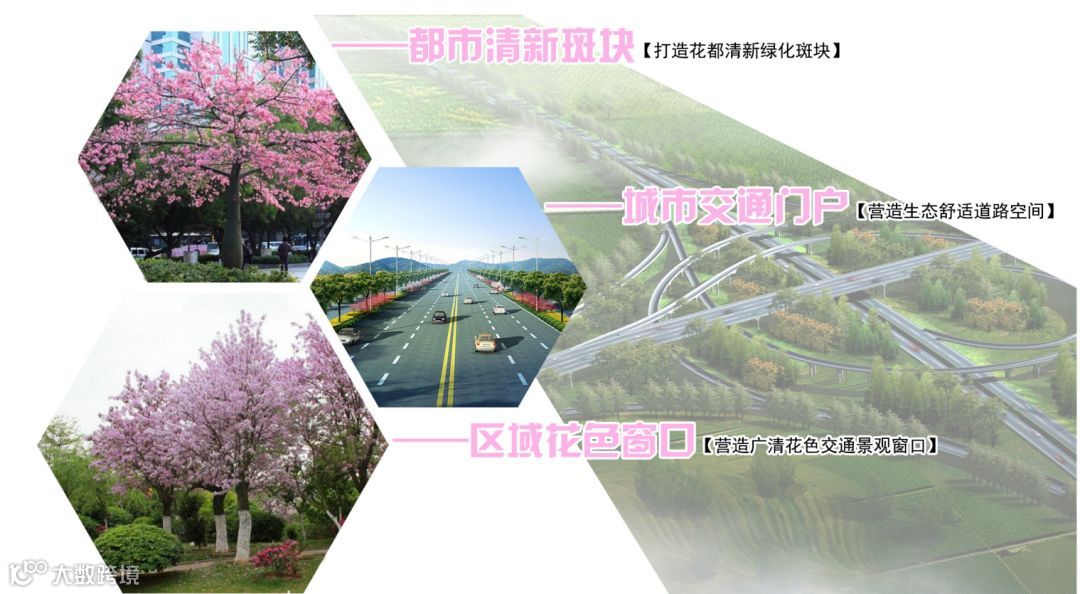 海㘵立交出入口作为连接花都区与广州市区交通的重要枢纽点,通过对其周边绿地林冠线及绿地组成进行升级改造,创造地标性道路绿化空间,点亮海㘵立交出入口在花都区交通流线中的新形象,打造“活力线条,层林缀花” 新形象,成为花都清新的绿色斑块、广清花色交通景观窗口。