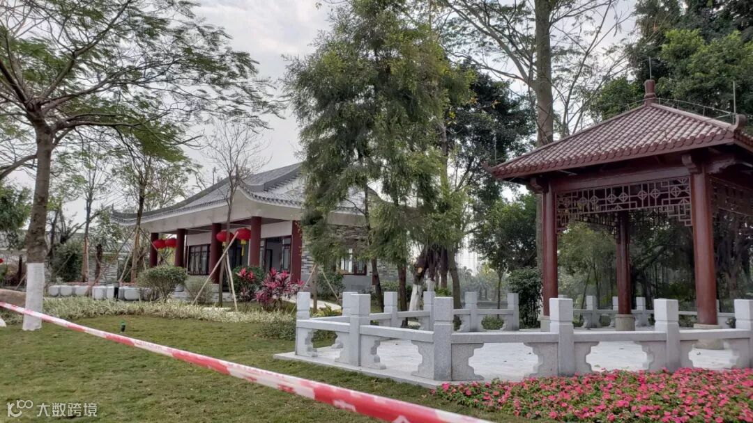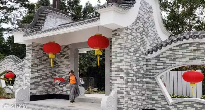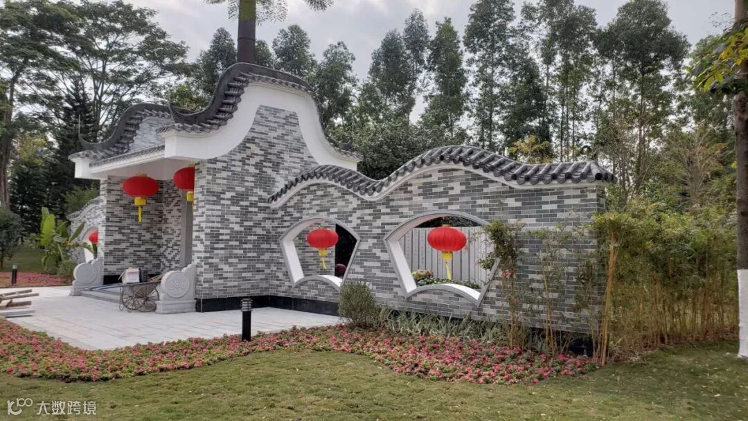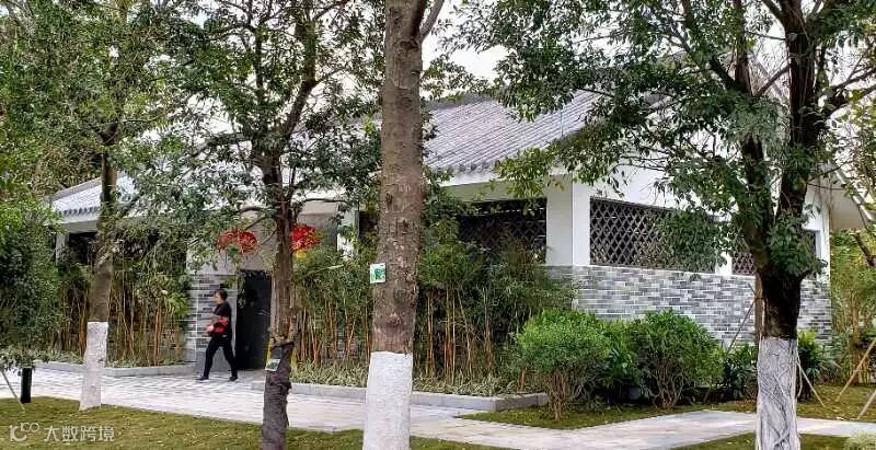仿古建筑是本项目的主要建筑形式,建筑物的屋顶均使用筒式灰瓦,外墙青砖饰面或为白粉墙,木作施以栗色,整体风格简约而古朴。入口处的门坊采用岭南风格的锅耳墙,墙垣设有空窗,园内景色呼之欲出;母婴室为九脊顶大屋,正脊为泥鳅脊,四条戗脊又与一般的制式不同,犹如江南的亭子——翼起;公共厕所为悬山式屋顶,采用梁柱承重,墙体上部镂空,利于通风;曲廊临水而建,曲折回转,廊内临水一面设有美人靠围护,游人可以在此休息,也可举目远眺,美景尽收……