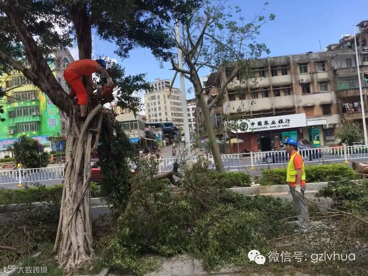 迎着落日余晖,抢险队员在湛江第九小学门口开展绿化抢险