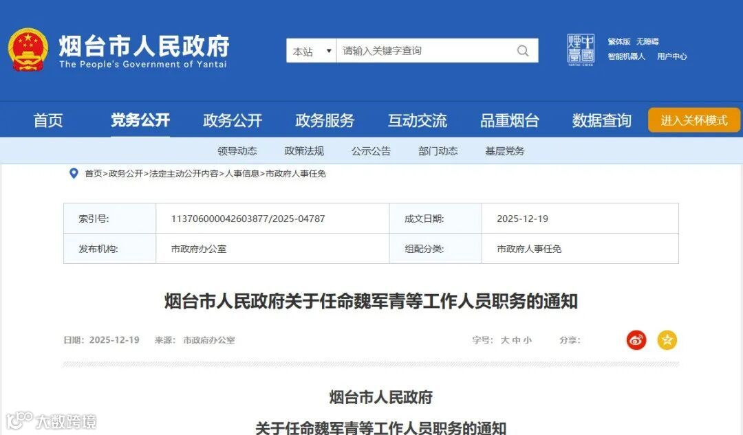 导读:12月19日,烟台市人民政府网站发布任命职务通知。其中,任命魏军青为烟台市公安局政委。