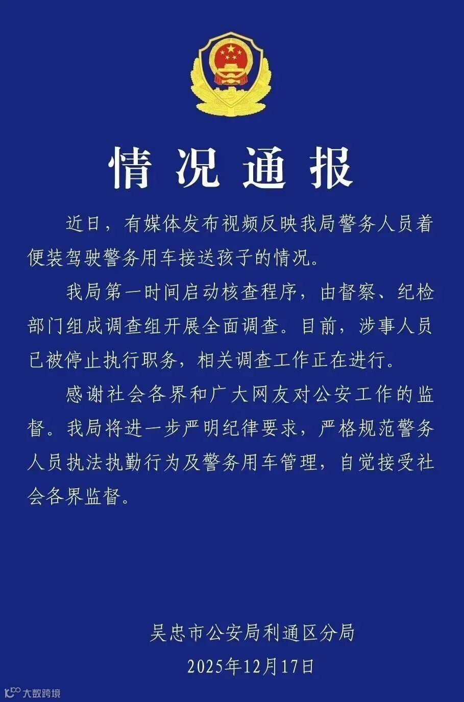 针对此事,12月17日,宁夏吴忠市公安局利通区分局发布《情况通报》,全文如下: