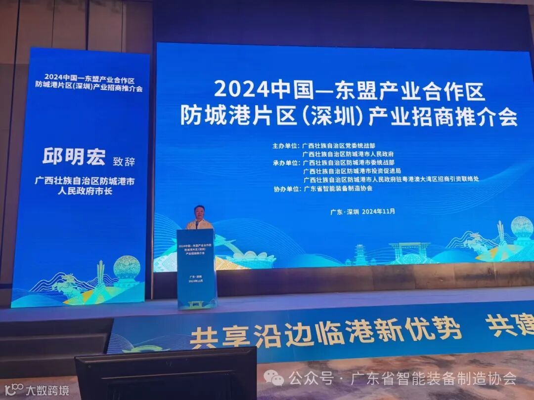 积极响应东西部协助号召,11月15日,由广西自治区党委统战部、防城港市人民政府主办、广东省智能装备制造协会协办的2024中国—东盟产业合作区防城港片区(深圳)产业招商推介会在深圳市举行。防城港市政府邱明宏市长出席并致辞。此次推介会以“中国东盟大市场,投资首选防城港”为主题,吸引了包括中国电子、海尔电子、红牌集团、兆驰股份、怡亚通股份、心里程集团、励丰文化在内的100多位企业家代表齐聚一堂,共商合作。