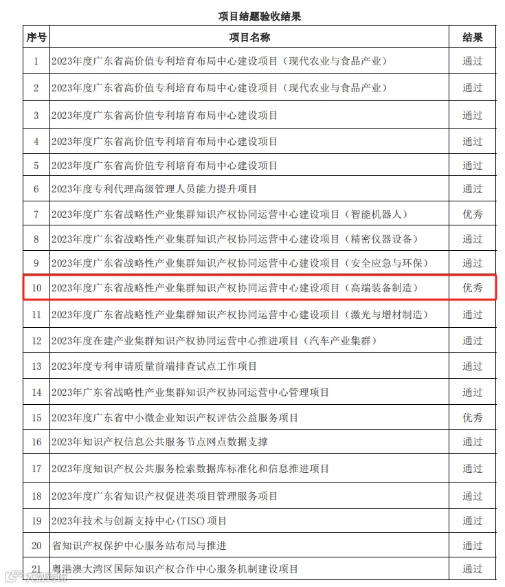 近日,广东省市场监督管理局发布消息,我会参建的广东省战略性产业集群知识产权协同运营中心建设项目(高端装备制造)顺利通过验收,并荣获优秀评级。