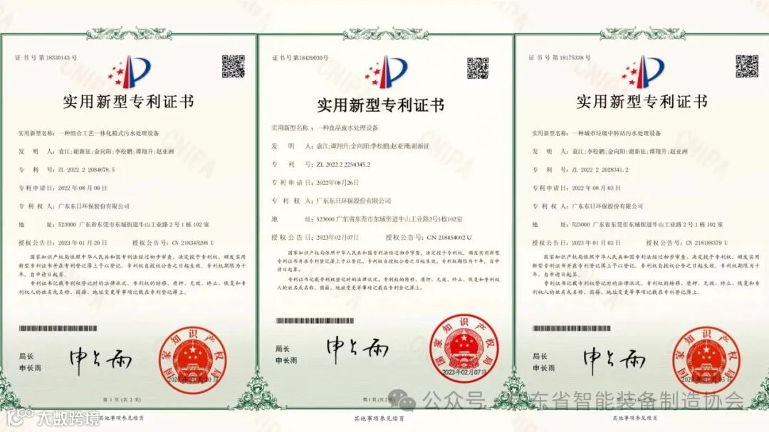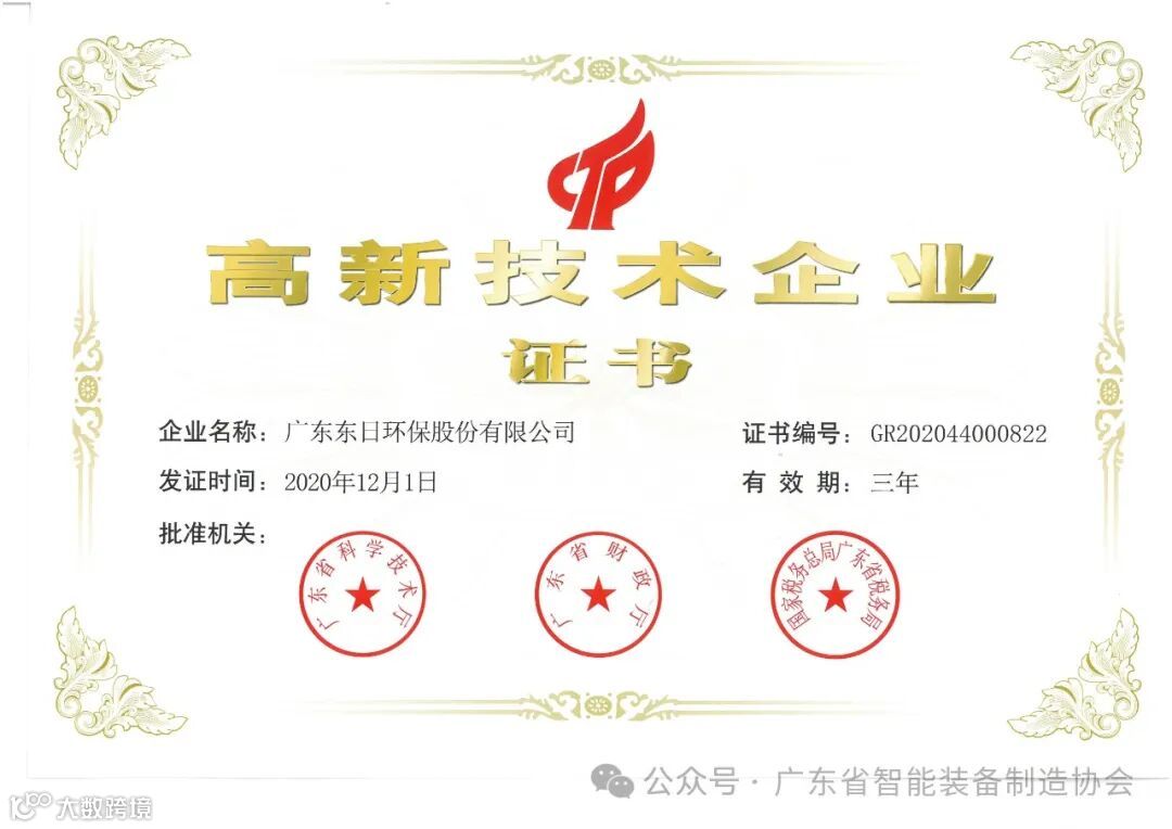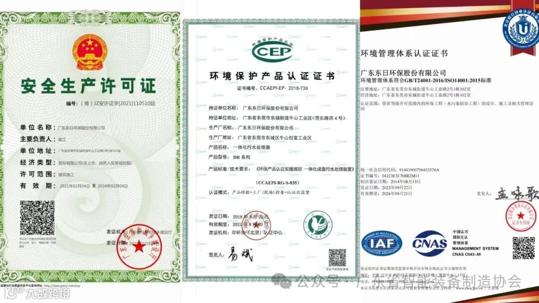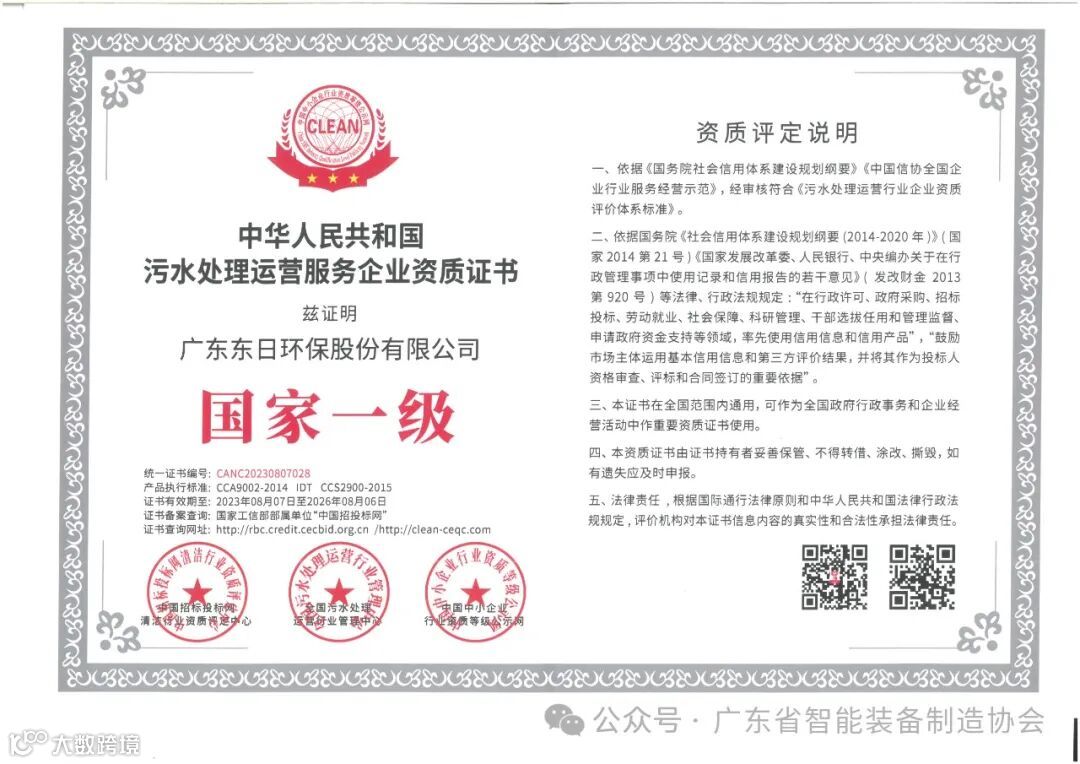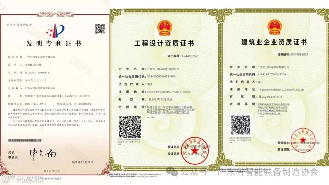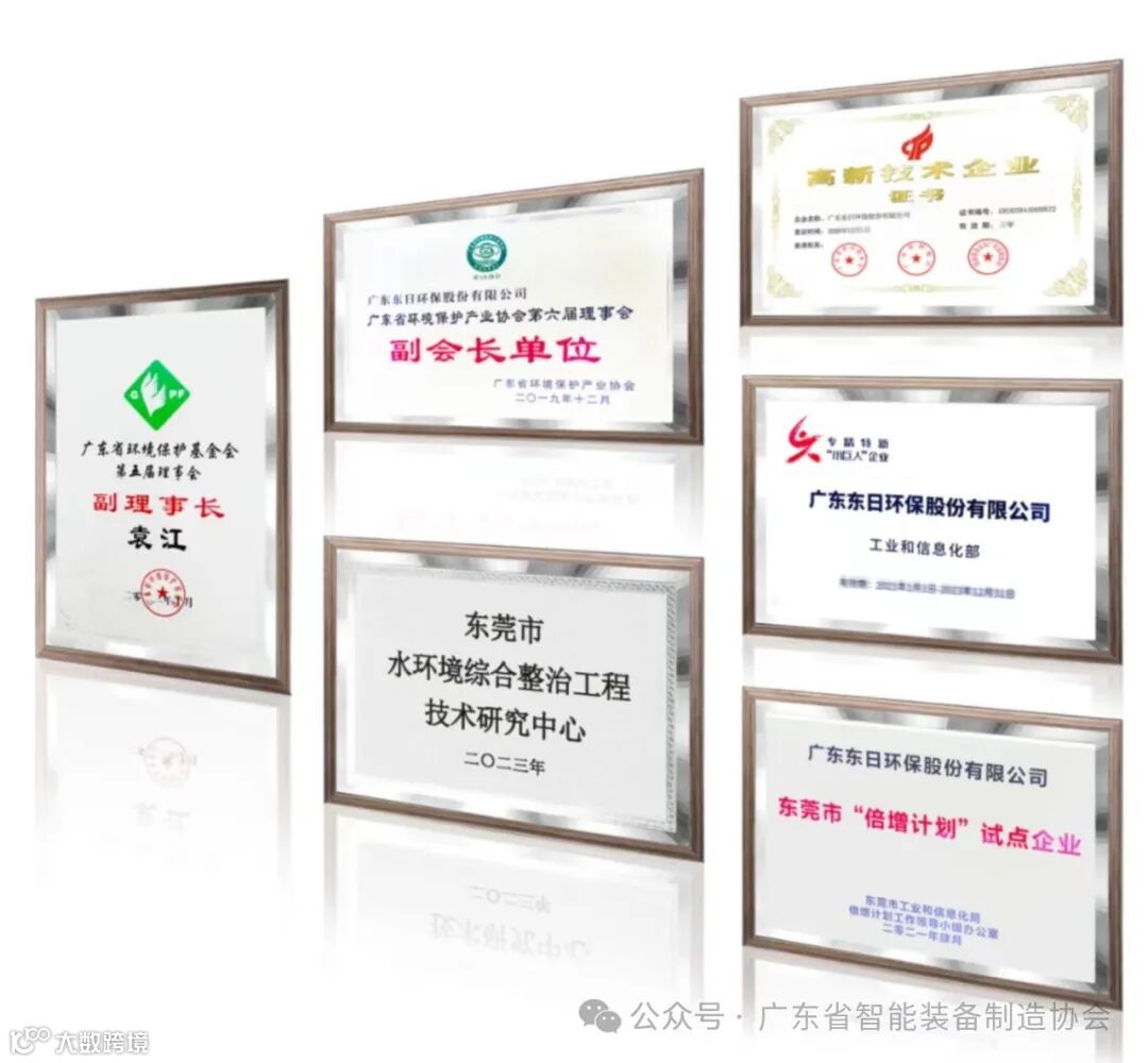 虎踞龙盘今胜昔,天翻地覆慨而慷。目前东日环保获得了“广东省环保产业协会常务副会长单位”、 “广东省著名商标”、“高新技术企业”、“东莞市倍增试点企业”等荣誉,具备环境工程设计甲级,市政工程、水利水电工程施工总承包,污水运营等资质。
