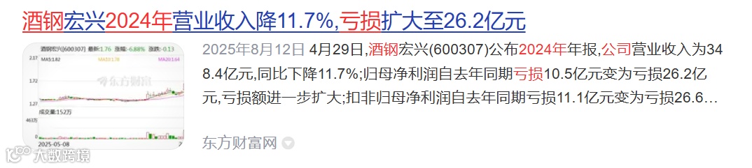 第九名:甘肃酒钢集团宏兴钢铁股份有限公司, 2024年亏损26.2亿。酒泉钢铁(集团)位于甘肃省嘉峪关市,始建于1958年,是国家最早规划建设的第四家钢铁联合企业。
