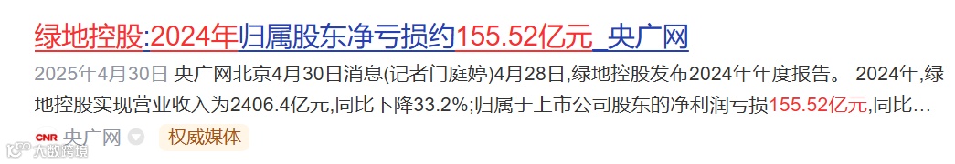 第三名:绿地控股集团,2024年亏损155.52亿元。绿地集团成立于2002年,是上海市国资委监管企业。2024全年亏损155.52亿。