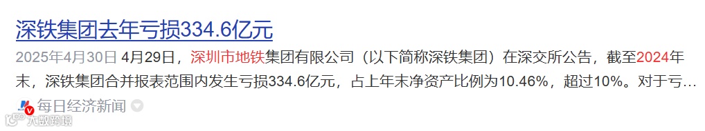 第一名:深圳地铁集团,2024年亏损334.6亿。深圳地铁集团成立于1998年,是深圳市属企业。然而2024年深圳地铁集团年报显示亏损了334.6亿元。这一切的原因就是入股万科成为大股东。