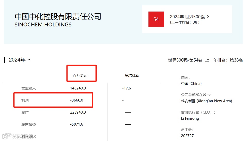 第二名:中国中化控股有限责任公司,2023年亏损263亿。该公司在2021年由中国中化集团与中国化工集团联合重组成立。