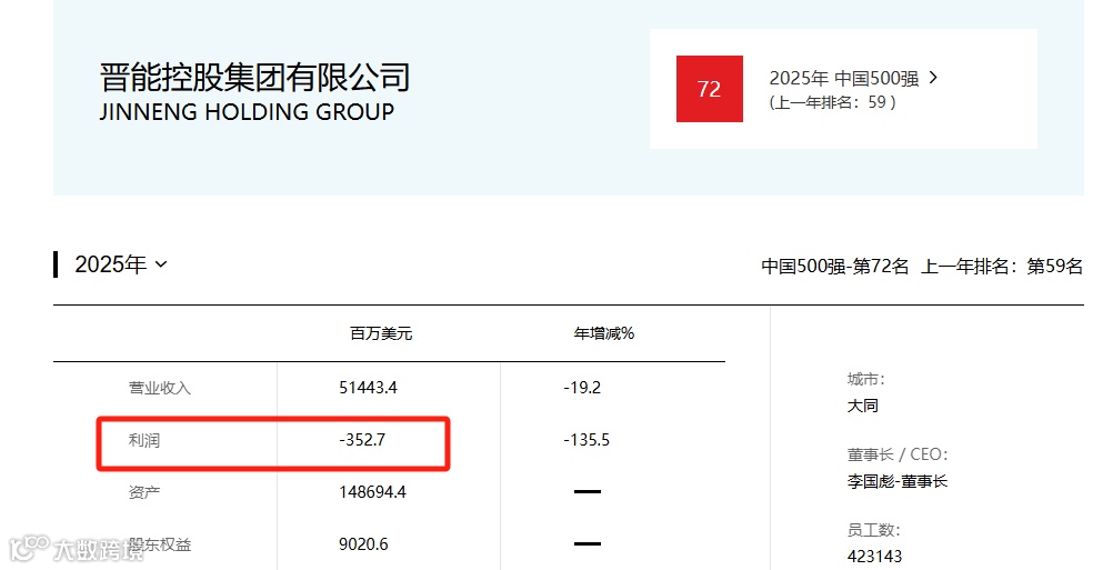 第十名:晋能控股集团,2024年亏损约25.3亿。作为山西省属企业,晋能集团于2020年联合重组原同煤、晋煤、晋能集团3家省属能源企业。
