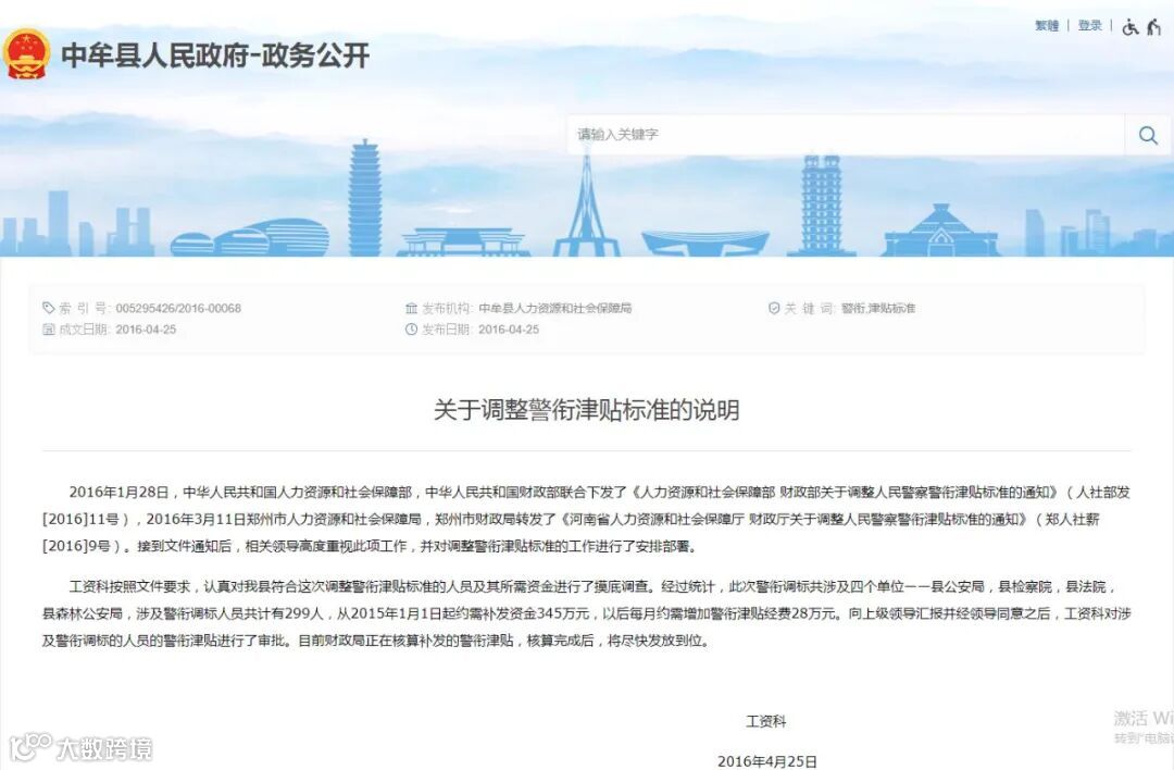 2016年1月28日,中华人民共和国人力资源和社会保障部、中华人民共和国财政部联合下发了《人力资源和社会保障部、财政部关于调整人民警察警衔津贴标准的通知》(人社部发〔2016〕11号),2016年3月11日郑州市人力资源和社会保障局,郑州市财政局转发了《河南省人力资源和社会保障厅、财政厅关于调整人民警察警衔津贴标准的通知》(郑人社薪〔2016〕9号)。接到文件通知后,相关领导高度重视此项工作,并对调整警衔津贴标准的工作进行了安排部署。