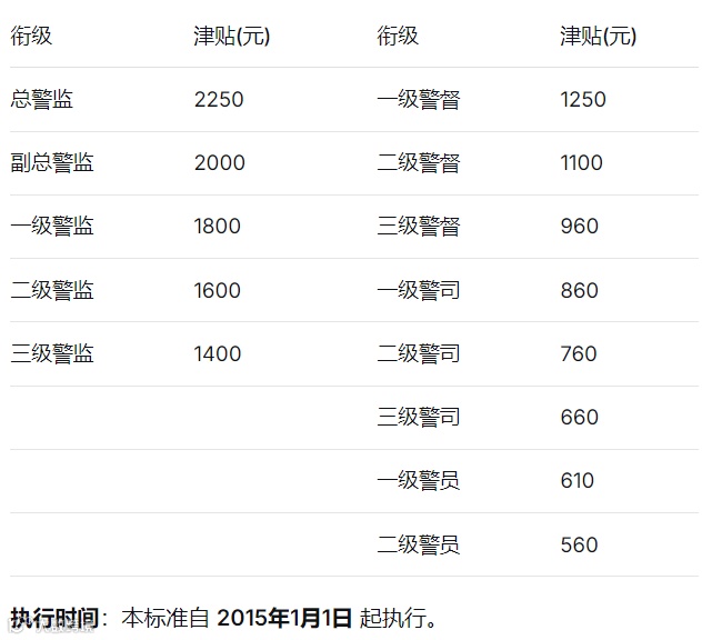 人民警察警衔津贴最新标准